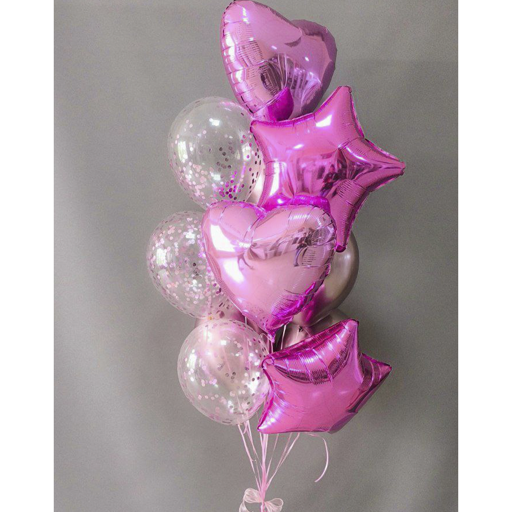 Ця зв’язка створена для тих, хто закоханий у рожевий відтінок у всіх його проявах. Блискучі сердечка та зірочки випромінюють романтику й теплоту, а прозорі кульки з конфетті додають грайливості та свіжості образу. Рожевий тут звучить як настрій — ніжний, радісний і трохи мрійливий. Така композиція легко прикрасить свято, стане яскравим акцентом на фото чи подарунком, який говорить замість тисячі слів.