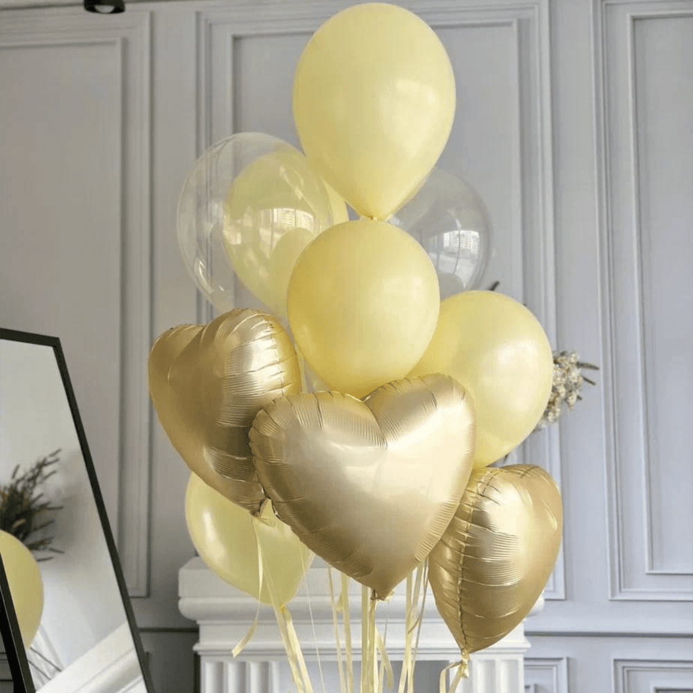 Ця чарівна композиція з золотистих кульок випромінює вишуканість і тепло. Серця додають нотки ніжності, створюючи неповторну атмосферу захоплення. Ідеальний акцент для незабутнього свята, що дарує радість та натхнення.