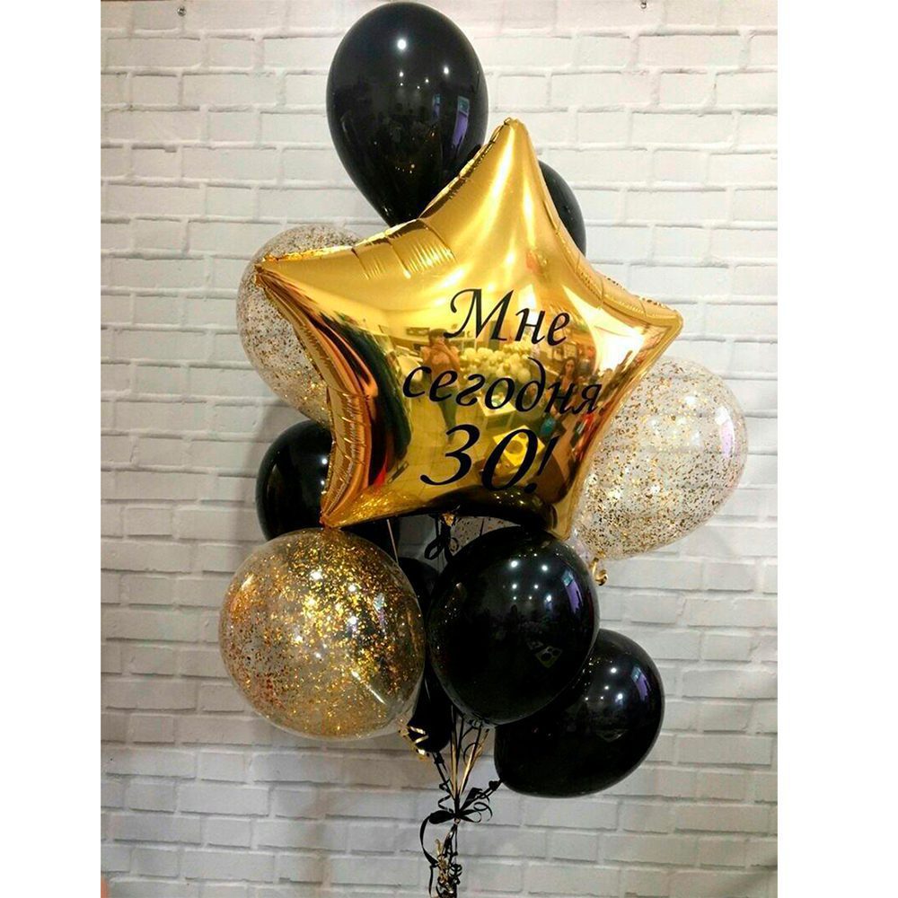 Ця ефектна композиція виражає урочистість та святковий настрій. Центральним елементом є кулька у формі зірки з золотим відтінком, що символізує важливість 30-річного ювілею. Поєднання чорних і прозорих кульок з блискучим конфетті додає елегантності та шарму, створюючи атмосферу розкоші. Ідеальний спосіб підкреслити значущість і радість особливого дня, наповнивши його блиском і приємними емоціями.
