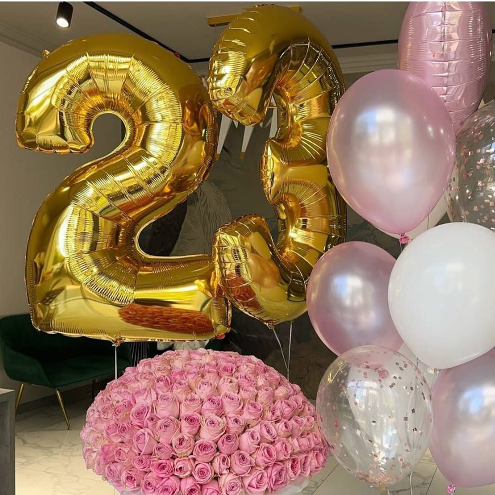 Яскраві золоті цифри підносять святковий настрій, вітаючи 23-й день народження. Поруч ніжні рожеві та білі кульки додають легкості та романтики, а величезний букет рожевих троянд втілює в собі витонченість і красу. Ідеальна композиція для незабутнього святкування в теплих кольорах щастя.