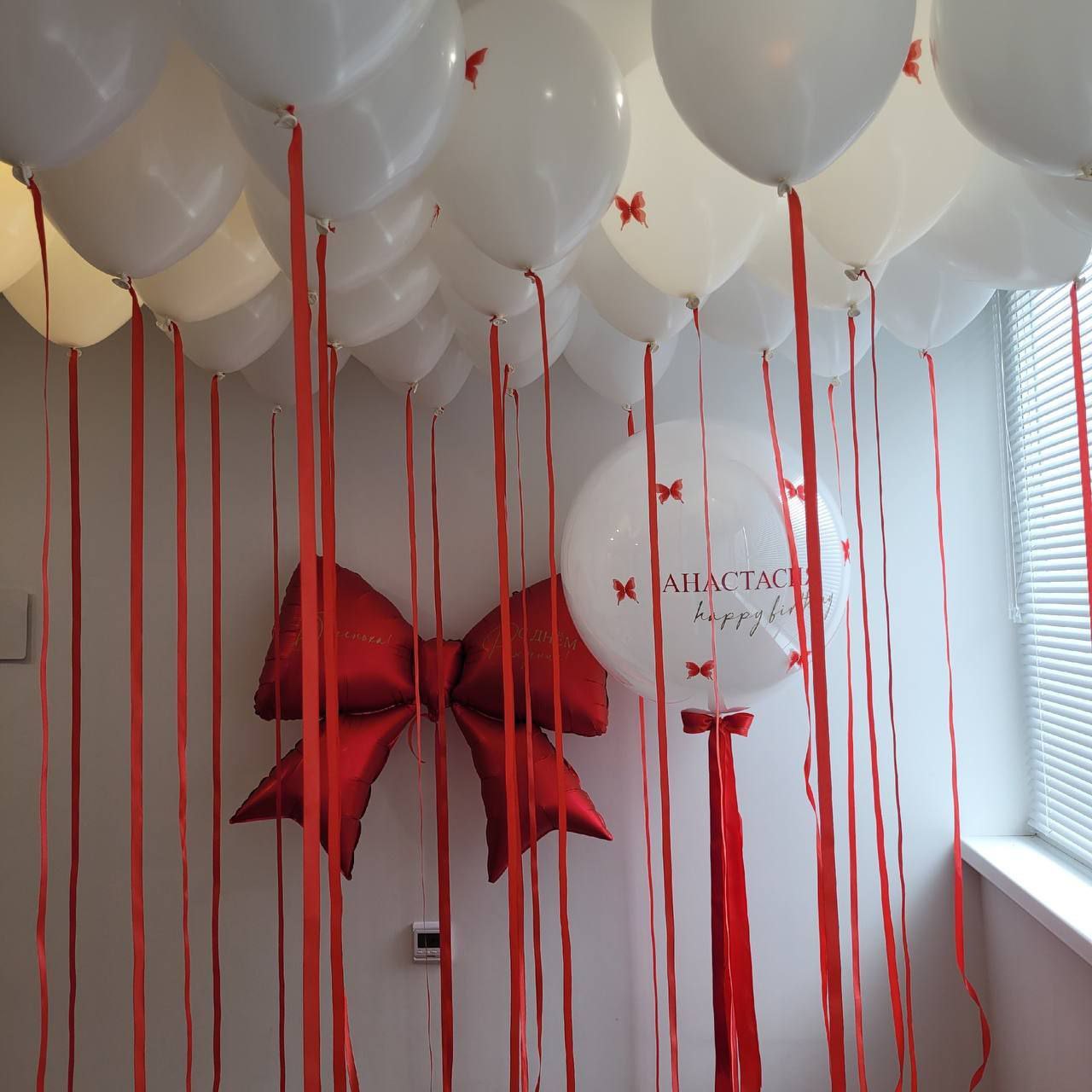 Ця композиція — справжнє втілення ніжності та стилю. Вона поєднує легкість білих повітряних куль із пристрастю яскраво-червоних акцентів. Довгі шовкові стрічки створюють ефект повітряної завіси, що ніжно спадає донизу, ніби мить перед поцілунком. У центрі — розкішний червоний бант, символ уваги, турботи й урочистості.
