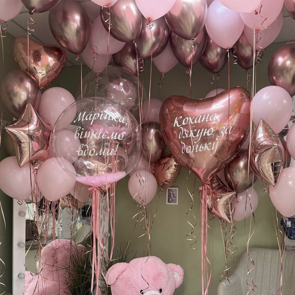 Ця ніжна композиція з кульок занурює в атмосферу любові та тепла. Рожеві та золоті відтінки створюють відчуття свята та радості. Великі кулі з написами виражають теплі вітання та вдячність. Композиція ідеально підходить для зустрічі новонародженої дівчинки або вираження любові та підтримки близьким. Це справжній символ ніжності та сімейного затишку.