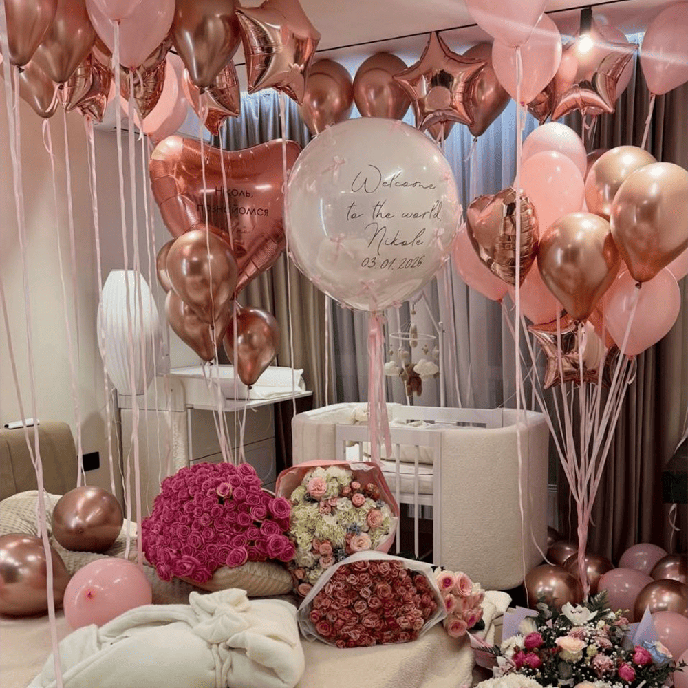 Ця чарівна композиція з кульок та квітів створена для святкування магічного моменту — появи нового життя. Пастельні рожеві, ніжно-золоті та бронзові відтінки кульок доповнюють атмосферу теплом і любов’ю. Великі серця, зірки, і прозора кулька з теплими привітаннями роблять цю композицію особливо зворушливою. Це особливе вітання в світ прекрасного майбутнього.