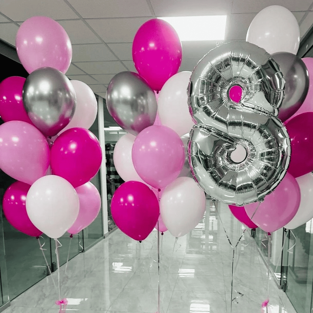 Цей витончений мікс з рожевих, срібних і білих кульок захоплює гармонією і елегантністю. Срібляста вісімка додає урочистості і символізує нескінченність щасливих моментів. Ідеальне поєднання для створення незабутньої атмосфери свята.