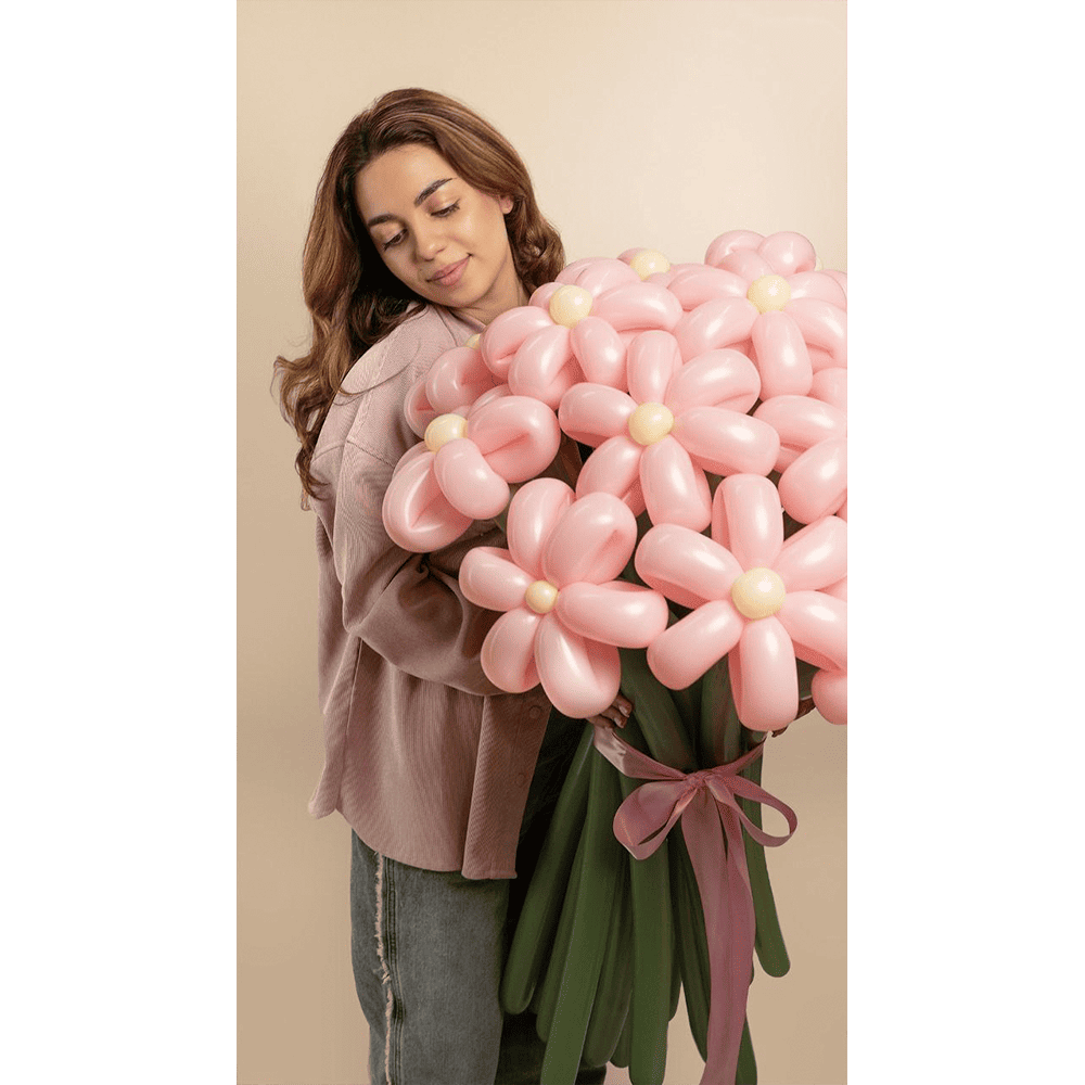Цей ніжний букет з повітряних кульок у м’яких рожевих тонах втілює легкість і витонченість весняних мрій. Великі квіти на зелених стеблах створюють образ, що наповнює радістю і натхненням. Ідеальний подарунок для тих, хто цінує чарівність моментів та естетику в найдрібніших деталях.
