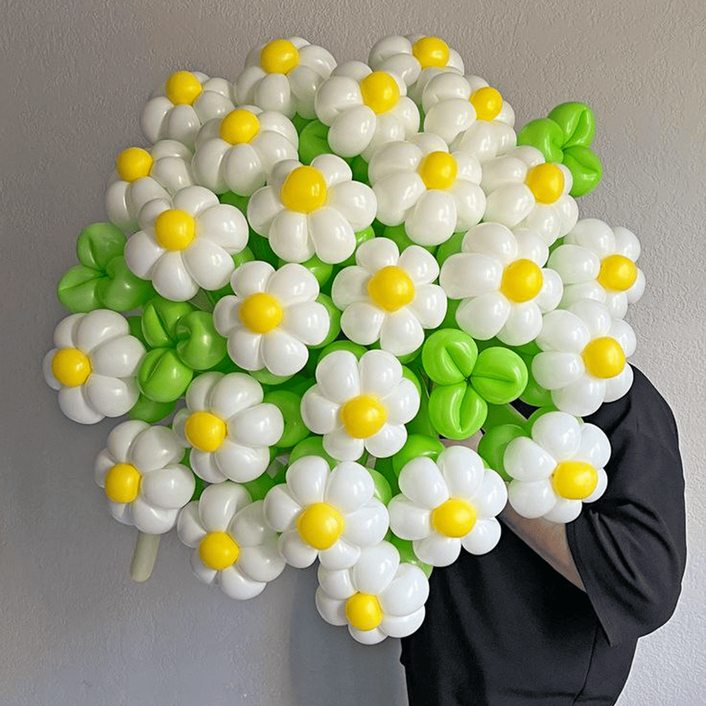 Цей чарівний букет з повітряних кульок вражає своєю ніжністю та природністю. Яскраві жовті серединки, оточені білосніжними пелюстками, створюють атмосферу весняної легкості і радості. Ідеально підходить для дарування гарного настрою і теплих емоцій в будь-який день.