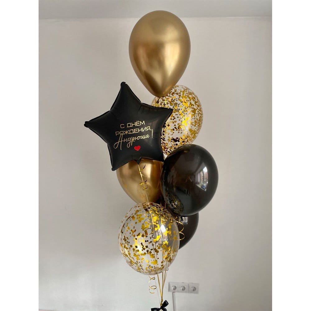 Яскрава та стильна композиція повітряних кульок у золотих, чорних та прозорих відтінках з конфеті — це ідеальний сюрприз для святкування Дня народження! Чорна зірка з індивідуальним написом додає особливого шарму та робить подарунок максимально особистим.
