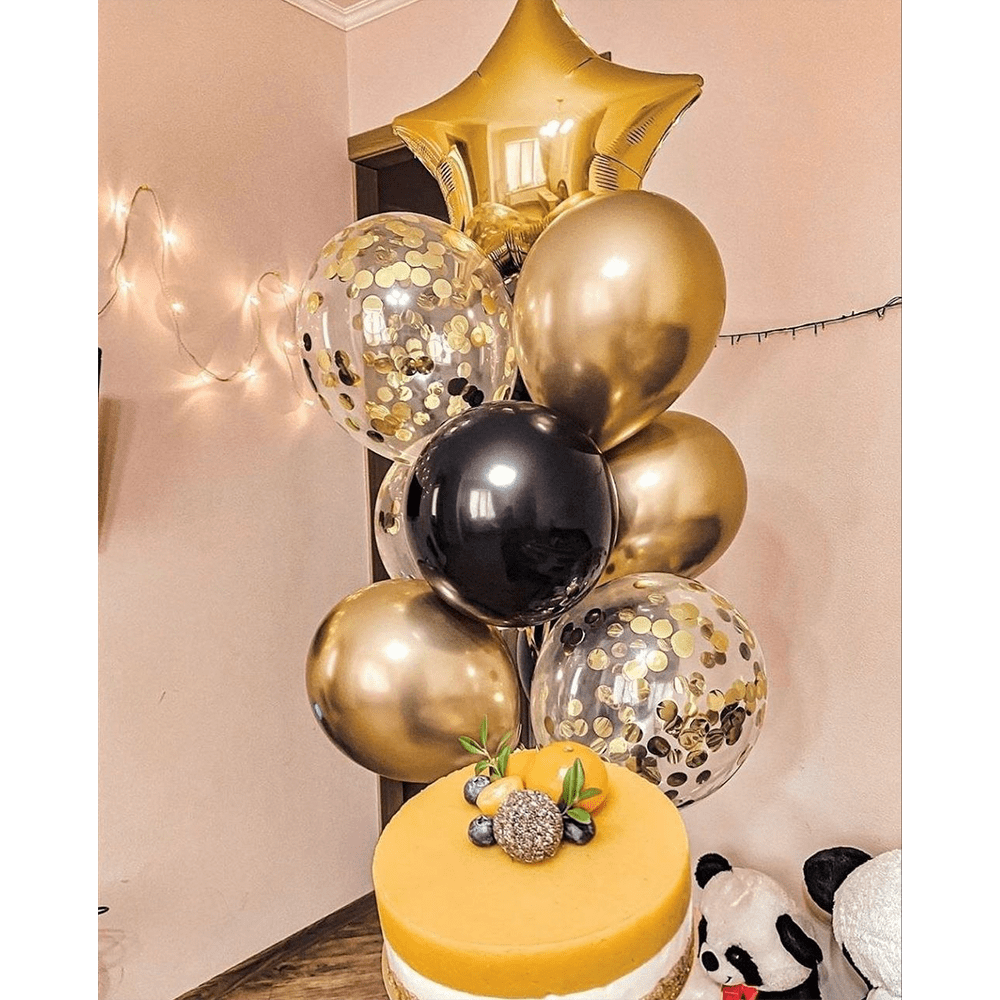 Захоплюючий ансамбль куль, що поєднує золото, чорний і прозорі елементи з конфеті, створює атмосферу чарівної казки. Зірка серед них виблискує, як символ здійснення мрій, передаючи тепло і стиль святкового вечора.