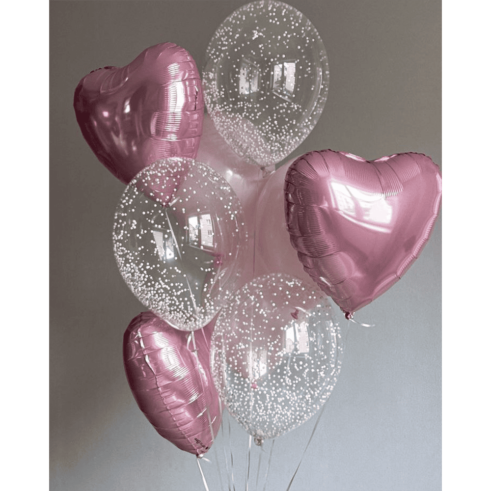На фото зображені ніжні повітряні кульки, що неначе ваблять у світ незабутніх моментів. Рожеві серця символізують теплі почуття, а прозорі кульки з білими цятками створюють ефект чарівності та таємничості. Разом вони утворюють легке і чаруюче видовище, яке піднімає настрій і запрошує мріяти.