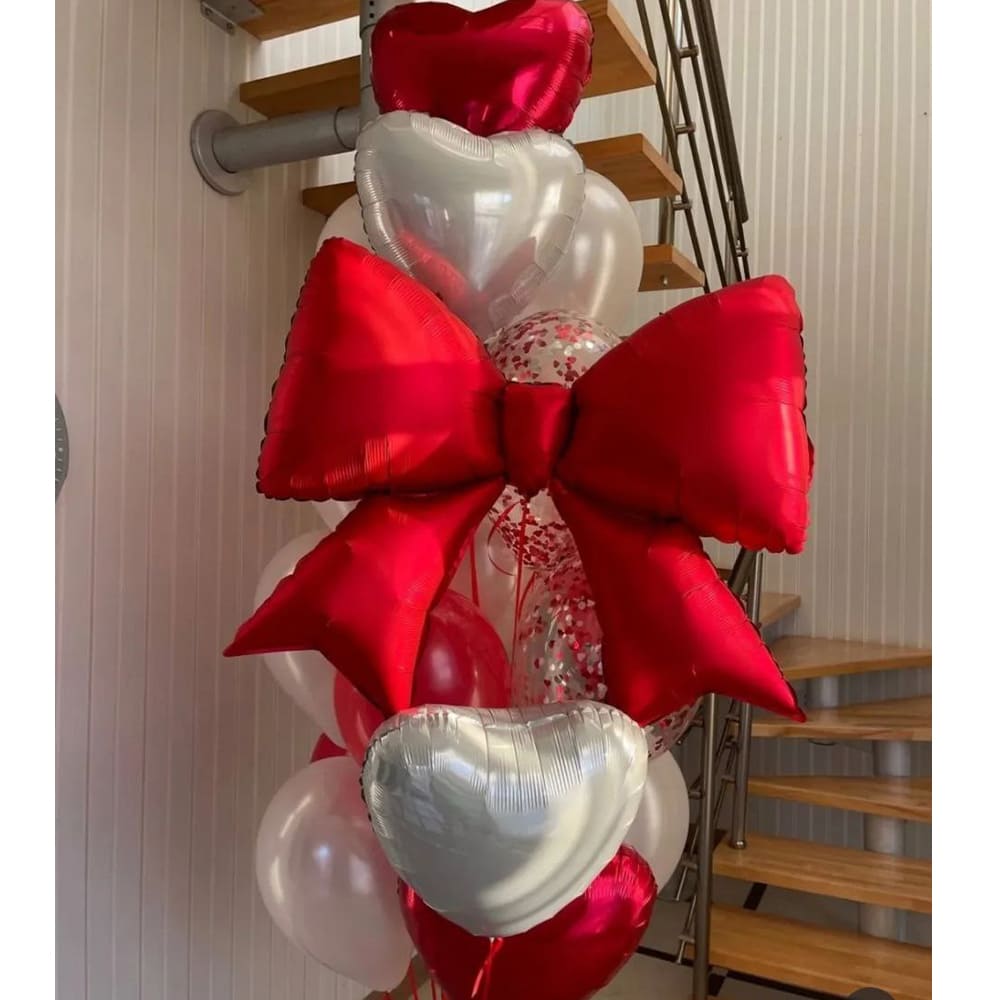 Перетворіть ваш захід на справжнє свято почуттів з цією чарівною композицією з червоними та срібними серцями, увінчаними розкішним бантом. Ідеальний вибір для романтичних моментів, що захоплюють та надихають.
