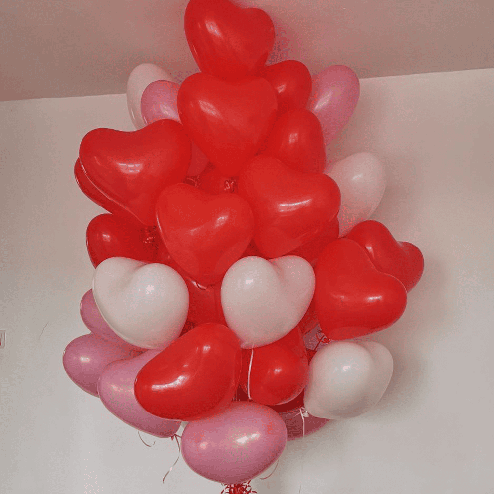 На фото зображені кульки у формі сердець, які гармонійно поєднують відтінки червоного, білого і рожевого. Яскраво-червоні кульки надають композиції драматизму і пристрасті, тоді як ніжні рожеві і білі додають легкості й романтичності. Разом вони створюють атмосферу тепла і свята, підкреслюючи радісні моменти життя.