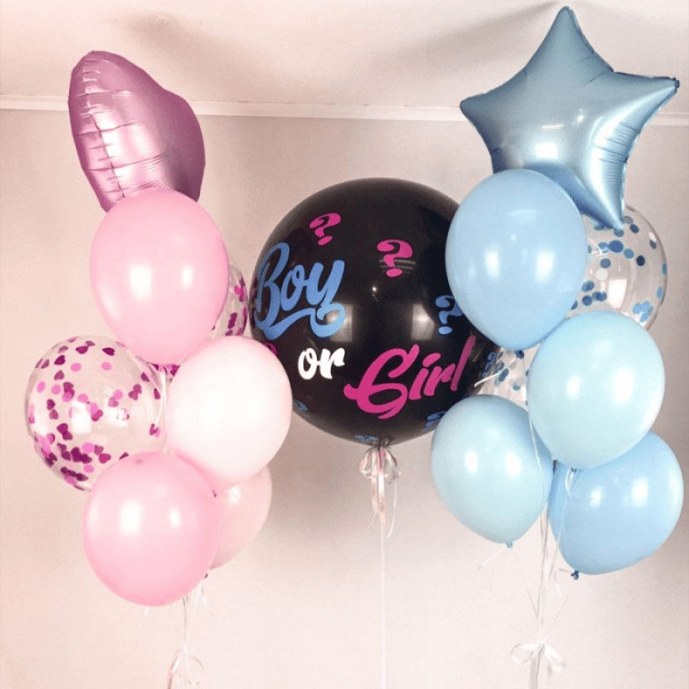 Ця композиція з кульок одночасно ніжна і загадкова. Чорна куля з написом “Boy or Girl?” оточена веселими різнокольоровими кульками, створюючи атмосферу передчуття великої новини. Сяйво зірки та романтичне серце додають нотки чарівності, роблячи цей момент незабутнім.