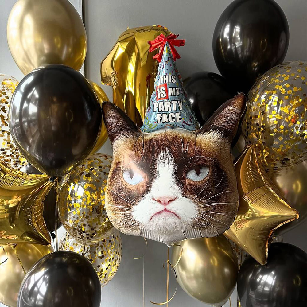 Зустрічайте композицію “Король вечірки” — вибух синтезу гумору, стилю та святкового настрою. Центральним акцентом є повітряна куля у формі знаменитого кота із незворушним виразом обличчя та святковою шапочкою. Його саркастичний погляд додає суміш іронії та веселощів, нагадуючи про те, що справжнє свято — це можливість бути собою. Тематичні кулі в чорних і золотих тонах сяють, як зірки на нічному небі, створюючи атмосферу справжньої вечірньої феєрії. Блискучі золото-чорні конфетті додають святковості, відсвічуючи виблискуючими відблисками в променях світла. Кожен елемент досконало поєднується між собою, підкреслюючи елегантність і витонченість загальної композиції. Це оформлення стане ідеальним вибором для вечірок із друзями, де гумор і стиль є невід’ємною частиною дозвілля. “Король вечірки” нагадує, що навіть у святковості є місце для іронії, завдяки чому кожен гість відчує себе частиною незабутньої події.