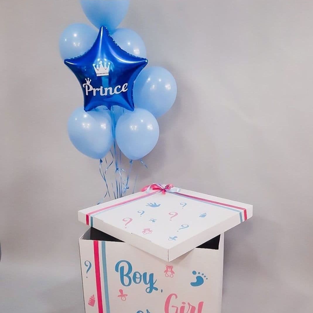 З цієї чарівної коробки з ніжно-блакитними кульками виривається на світ радісна новина — на горизонті з’явиться маленький принц! Зірка сяє, як символ нової надії та щастя, що вже ширяє в повітрі, огортаючи всіх присутніх теплотою та любов’ю.