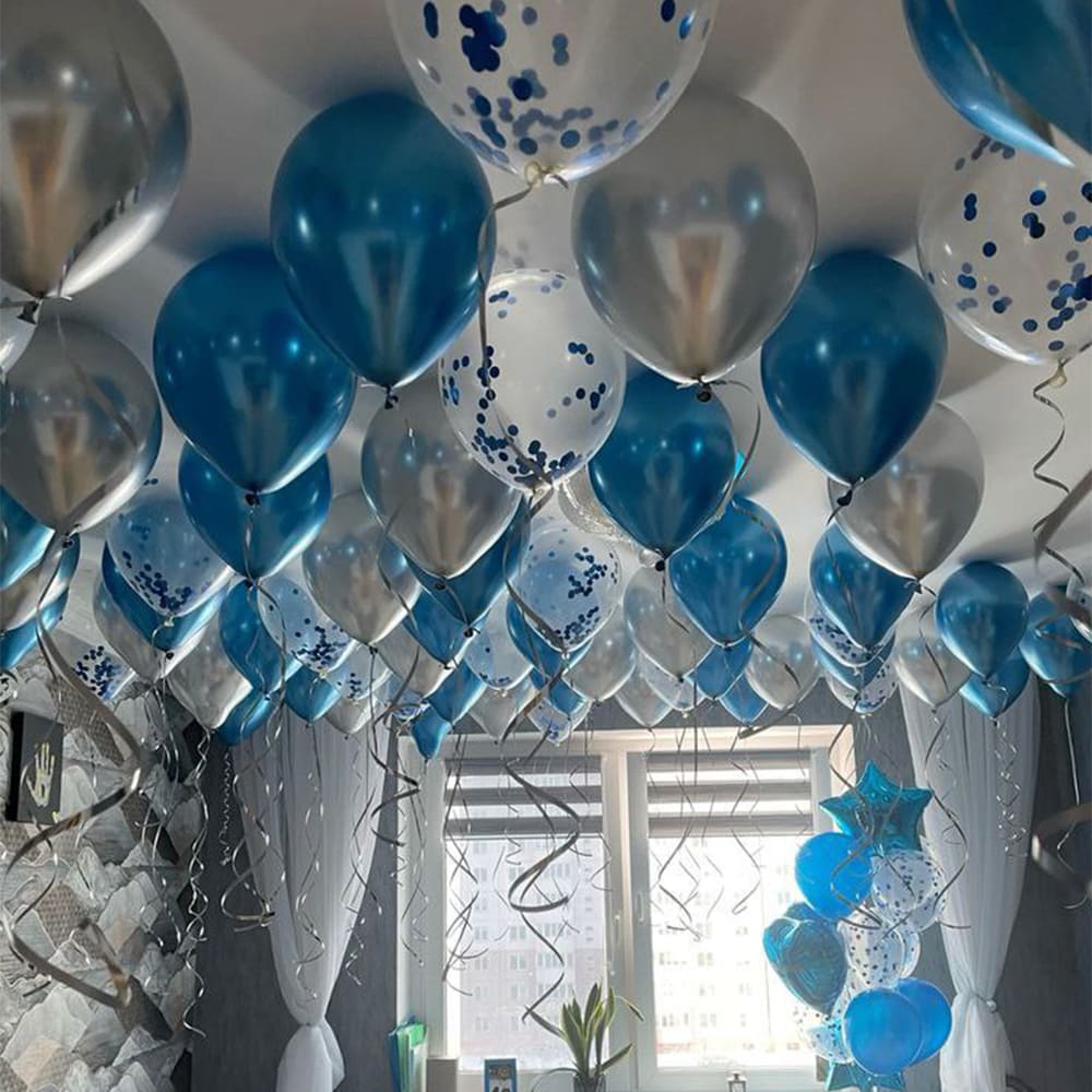 Сріблясто-блакитні кулі під стелею наповнюють кімнату легкістю та чарівністю. Вони нагадують небо, засіяне зірками, створюючи відчуття свіжості та свободи. Це атмосферне диво перетворює простір на місце для мрій та святкового настрою.