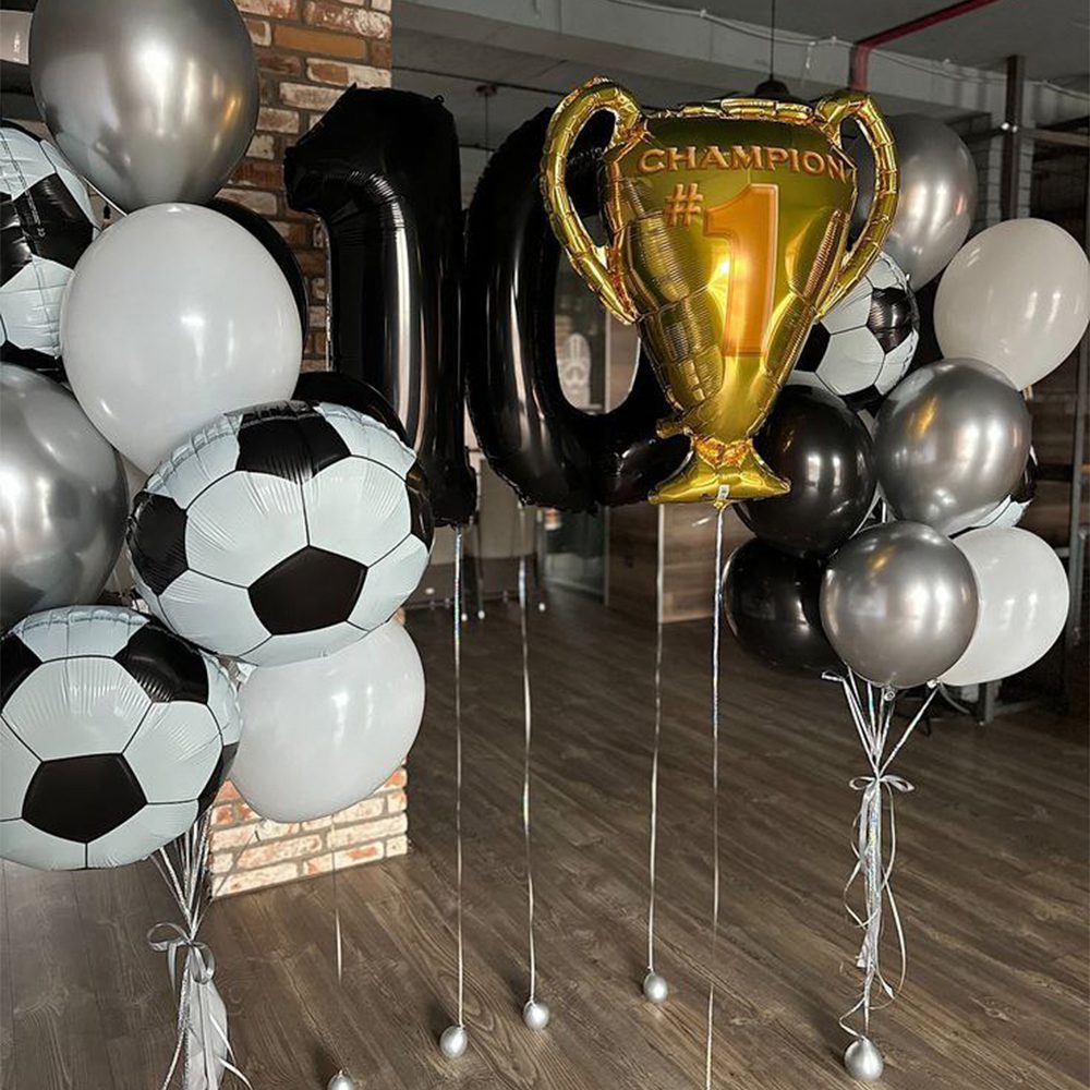 Це натхненне оформлення з кульок створює атмосферу справжнього футбольного свята. Поєднання куль у вигляді м’ячів, золотого кубка та цифр символізують перемоги та досягнення. Чорний, білий та сріблястий кольори додають елегантності та динамічності. Ідеальне рішення для свята на честь юного чемпіона або футбольного фаната, що любить перемагати.