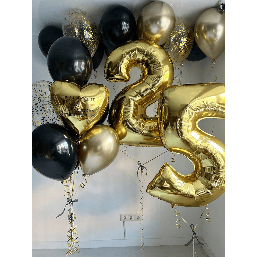 Розкішна повітряна композиція у глибоких чорних та сяйливих золотих відтінках, що підкреслює статус і важливість події. Великі фольговані цифри 25 у поєднанні з кульками з золотим конфетті створюють ефект елегантного святкового простору. Ідеальний вибір для ювілею, дня народження чи особливої дати, коли хочеться вразити стилем, блиском і атмосферою справжнього свята ✨🥂