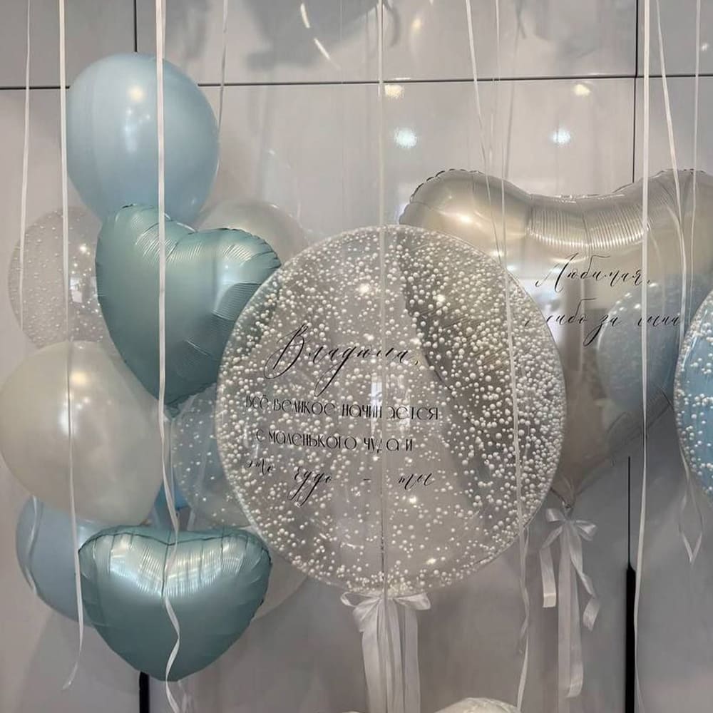 Ця ніжна композиція з блакитних і сріблястих кульок втілює атмосферу чарівності та таємничості. Прозорі кулі з елегантними дрібними акцентами додають легкості, ніби мрії втілилися у життя. Ідеальне оформлення, щоб поділитися радістю і теплом у цей незабутній момент.