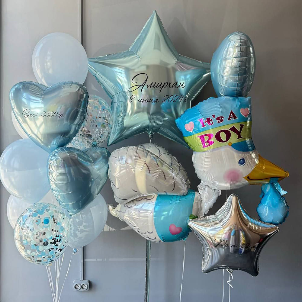 Ця стильна композиція в ніжних блакитних і сріблястих тонах підкреслює урочистість моменту народження хлопчика. Повітряні кулі у вигляді зірок і сердець, прикрашені особистими написами, створюють неповторну атмосферу свята. Чарівний лелека з пелюшкою сповіщає всім про це щасливе прибуття. Ідеальне оформлення для зустрічі новонародженого, яке підкреслить важливість цієї події та залишить теплі спогади на довгі роки.