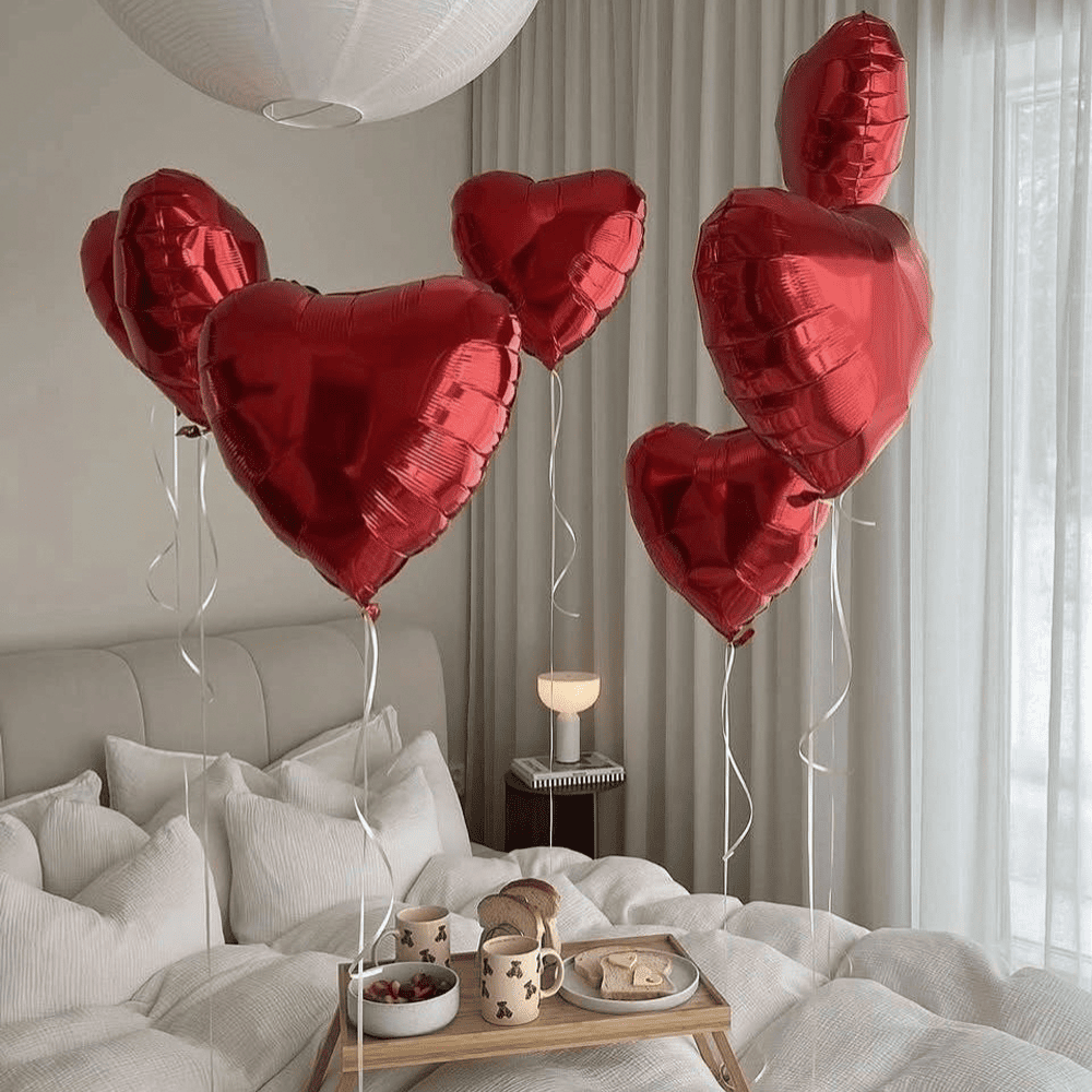 На фото зображені яскраво-червоні кульки у формі сердець, що витончено тримаються на білих стрічках. Вони випромінюють тепло і романтику, надаючи простору атмосферу свята і затишку. Їх блискуча поверхня відображає світло, надаючи композиції динамічність та ефектність.