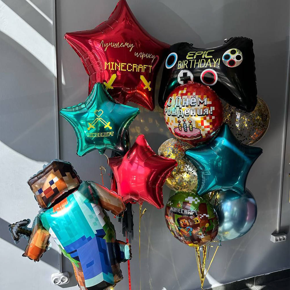 Фігурки улюблених героїв та декоративні блоки з кульок перетворять будь-яку кімнату на справжній світ Minecraft. Чудове рішення для дня народження або тематичної вечірки для маленьких геймерів!