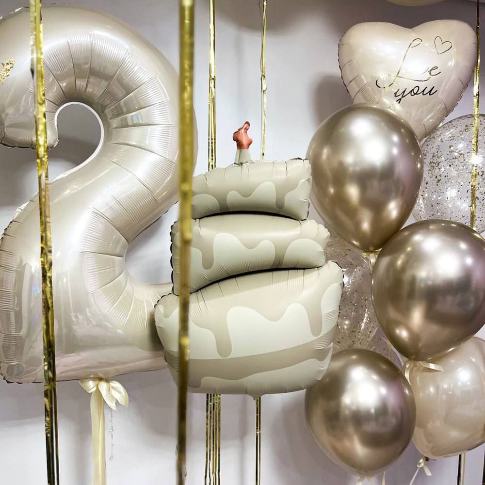 Відсвяткуйте знаменний день із витонченою композицією в золотистих і кремових тонах. Кульки у формі серця та торта додають романтичності й затишку. Ідеально підходить для особливих моментів, сповнених любові та щастя.