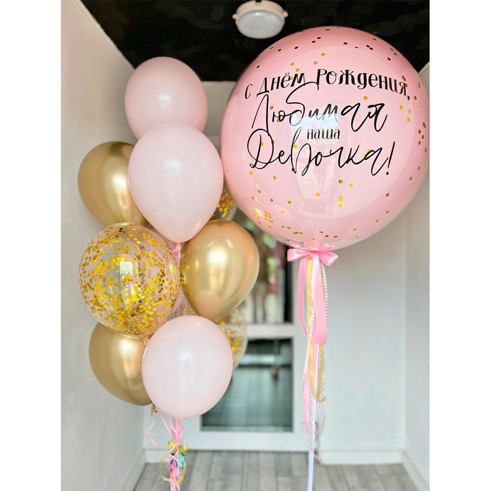 Ця чарівна та ніжна композиція ідеально підходить для святкування дня народження дорогої дівчинки. Велика рожева куля з теплим написом наповнює простір любов’ю і радістю. Золоті та прозорі кулі з конфетті додають елегантності та вишуканості. Це святкове оформлення створює атмосферу радості та казковості, роблячи цей день по-справжньому особливим.