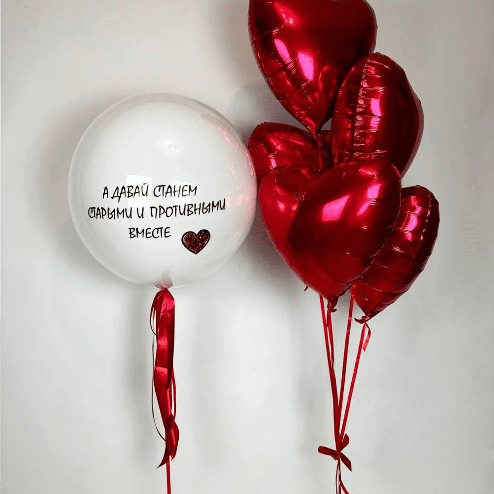Романтична композиція зі стильних повітряних кульок у формі сердець. Центральний білий шарик містить жартівливе й ніжне послання про спільне майбутнє. Яскраво-червоні серця поруч символізують щирі та глибокі почуття. Ідеально підходять для зізнання в коханні, річниці або особливого моменту, коли слова важливі так само, як і щирі емоції.