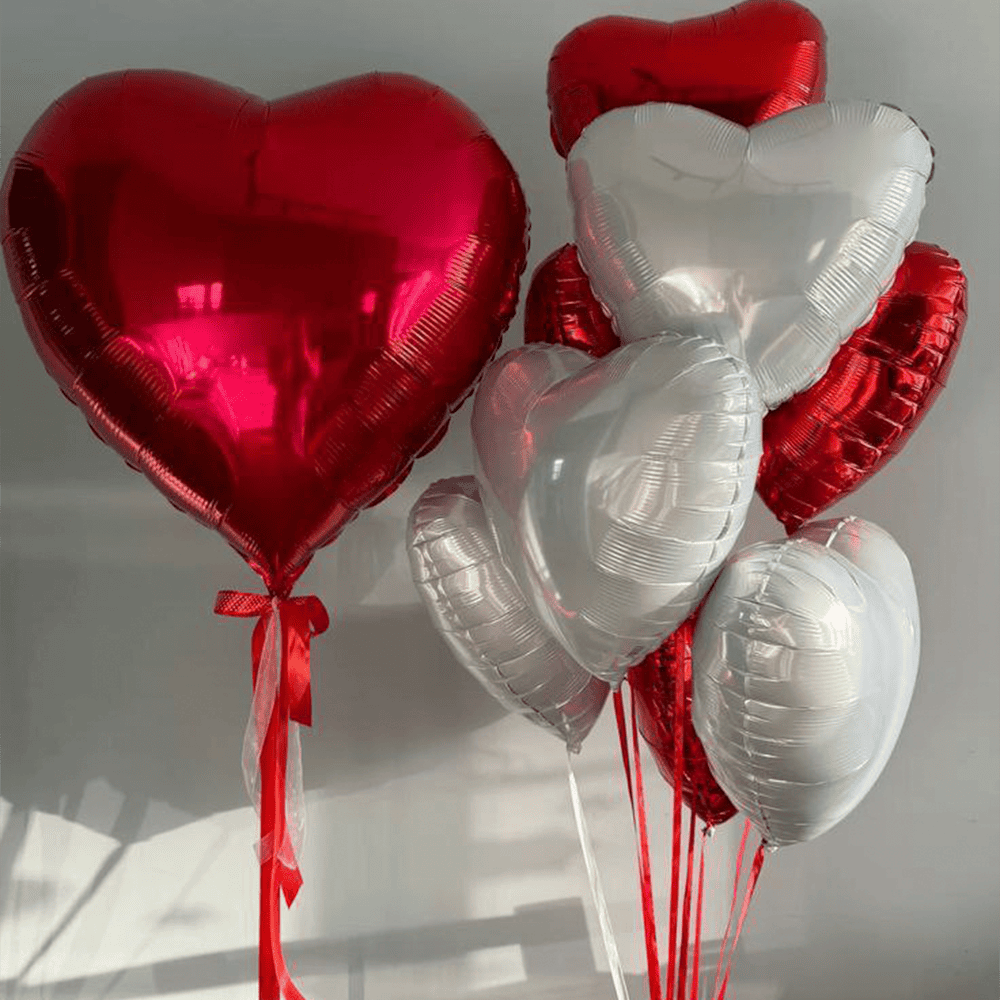На фото зображені кульки у формі сердець, що поєднують насичені червоні та елегантні білі відтінки. Великі червоні кульки випромінюють пристрасть і яскравість, в той час як білі додають витонченості та сяйва. Разом вони створюють врівноважену, святкову композицію, яка підкреслює елегантність і урочистість моменту.