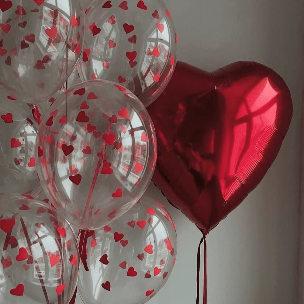 На фото зображені ніжні прозорі кульки, що всередині прикрашені розсипом маленьких червоних сердець, які додають їм грайливості і чарівності. Поруч розташоване велике насичено-червоне серце, яке випромінює яскравість і пристрасть. Разом ці кульки створюють яскраву композицію, яка нагадує про любов і радість.