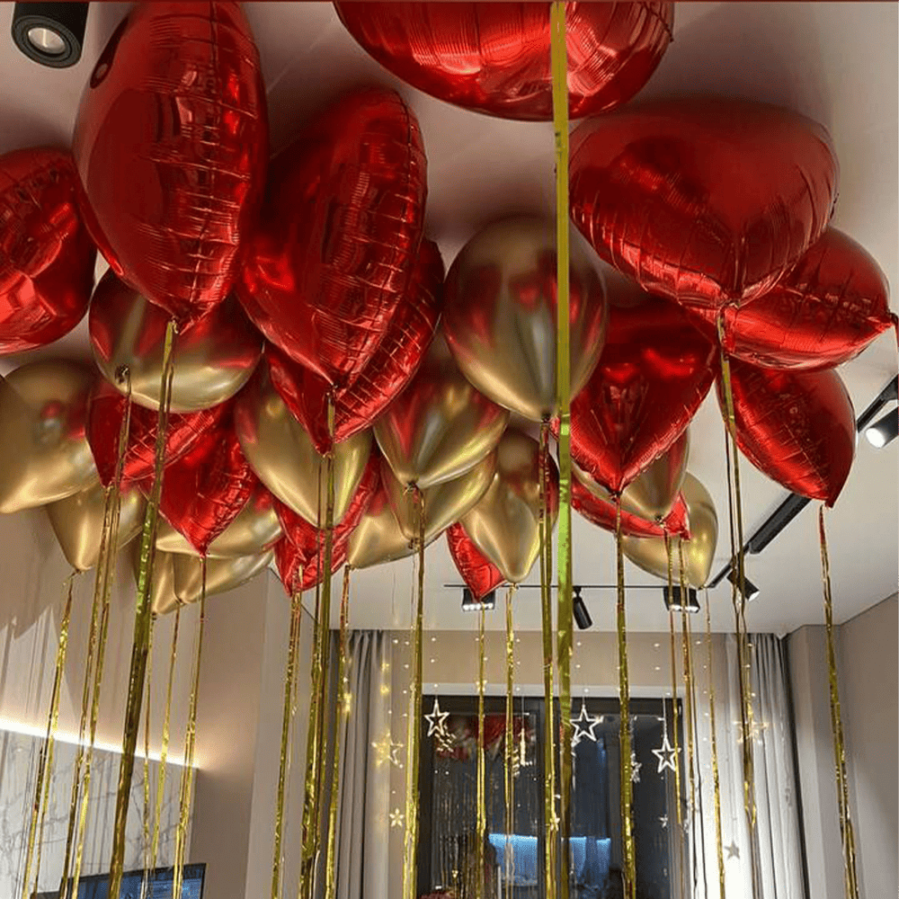 На фото представлено захоплююче поєднання червоних і золотих куль, які перетворюють кімнату на справжнє царство урочистості. Вони виблискують у світлі, створюючи атмосферу розкоші та вишуканості. Цей набір куль символізує свято і піднесений настрій, огортаючи простір сяйвом і затишком.