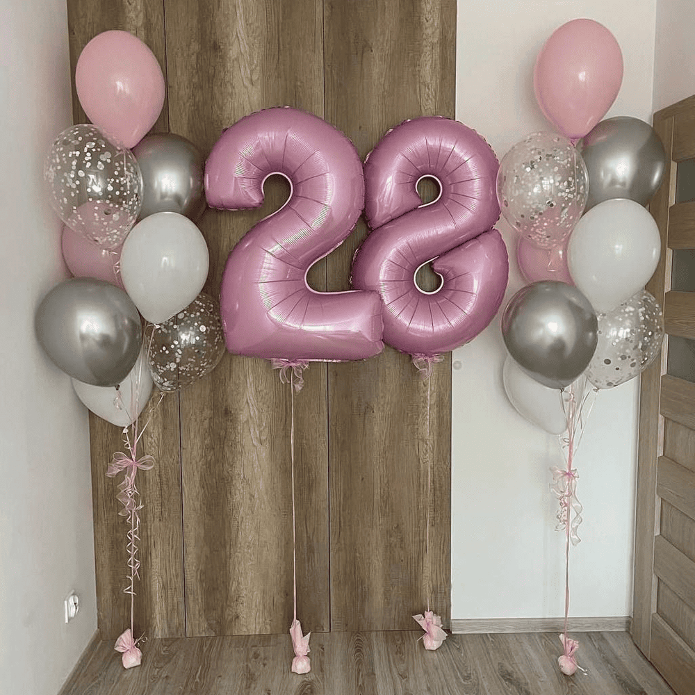 Ця ніжна композиція з повітряних кульок у рожевих і срібних відтінках створює атмосферу радості та вишуканості. Великі цифри акцентують на важливості святкового моменту. Ідеальне оформлення для події, яке наповнює простір теплом і захопленням.