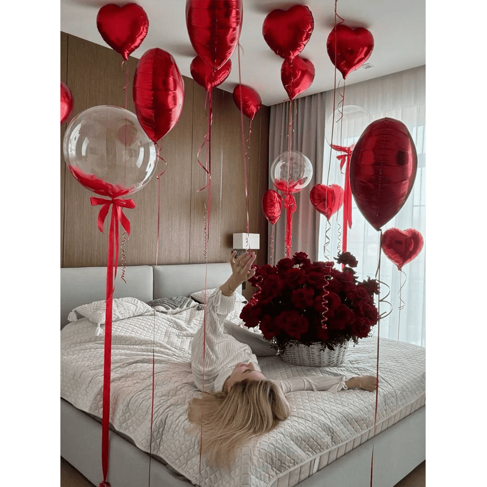 На фото зображені яскраво-червоні кульки у формі сердець, які витончено висять у повітрі, додаючи простору романтичного шарму. Прозорі кулі з червоними стрічками всередині надають композиції легкість і грайливість. Разом вони створюють елегантний контраст, підкреслюючи святкову атмосферу і додаючи простору особливого настрою.
