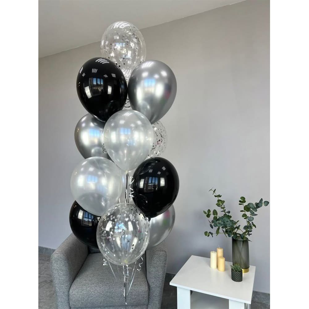 Ця стильна композиція з чорних, сріблястих і прозорих куль додає події особливого шарму та вишуканості. Лаконічне поєднання кольорів створює стриману елегантність, а грайливе конфетті всередині кульок надає святкового блиску. Ідеально підійде для витонченого святкування, залишаючи неповторні враження та радість у серці.