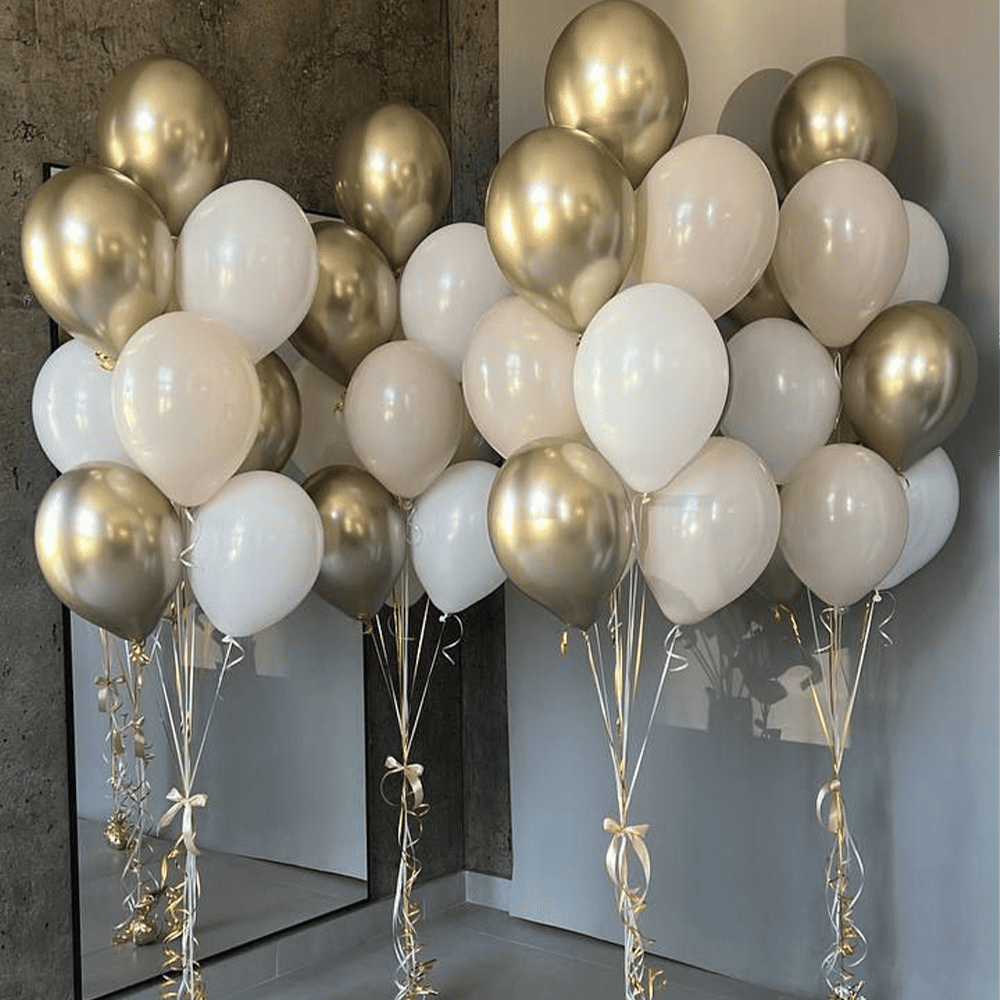 Цей розкішний набір кульок у золотих і білих тонах створює атмосферу вишуканості та святкового блиску. Ідеально підходить для престижних подій, де кожна деталь має значення. Золоте сяйво підкреслює важливість моменту, а ніжні білі акценти додають елегантності. Нехай це свято запам’ятається своєю величчю і красою!