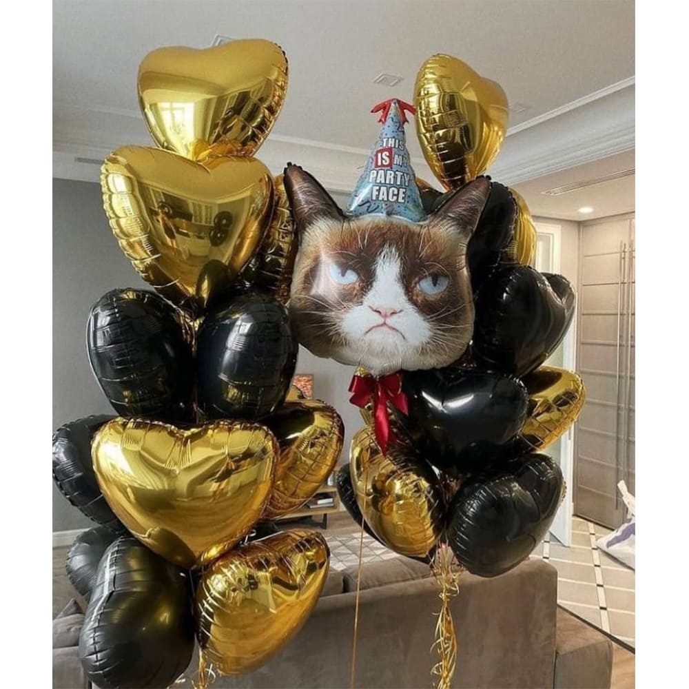 Ця грайлива композиція з куль у формі сердець у чорному та золотому кольорах, увінчана кумедним котом у святковому капелюшку, створює атмосферу веселощів і розкоші. Оригінальний дизайн поєднує шик і гумор, роблячи цю декорацію ідеальним вибором для яскравого святкування, повного несподіванок і радості.