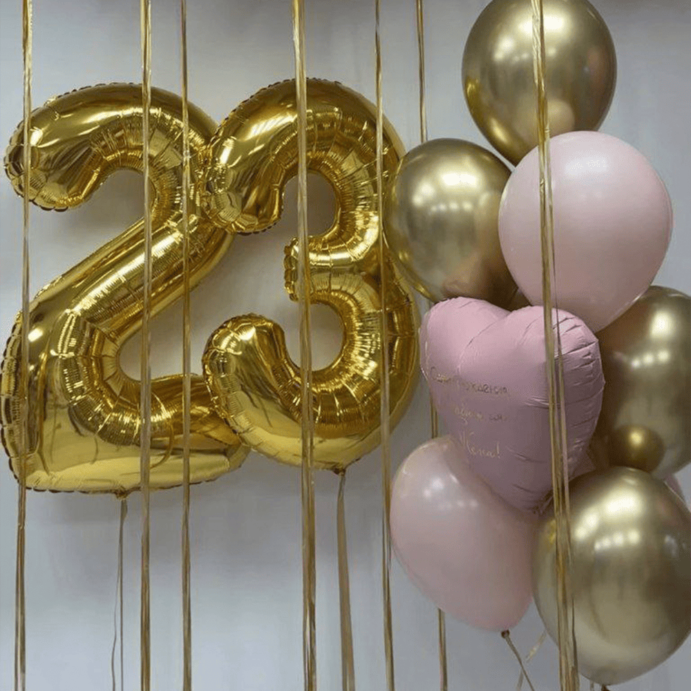 Ця елегантна композиція з кульок підкреслює красу і значущість особливого дня. Золоті цифри, оточені ніжно-рожевими і золотими кульками, створюють атмосферу розкоші та вишуканості. Сердечко додає нотку ніжності і тепла. Цей набір символізує новий етап і яскраві перспективи, наповнює простір святковим блиском і теплом незабутніх моментів.