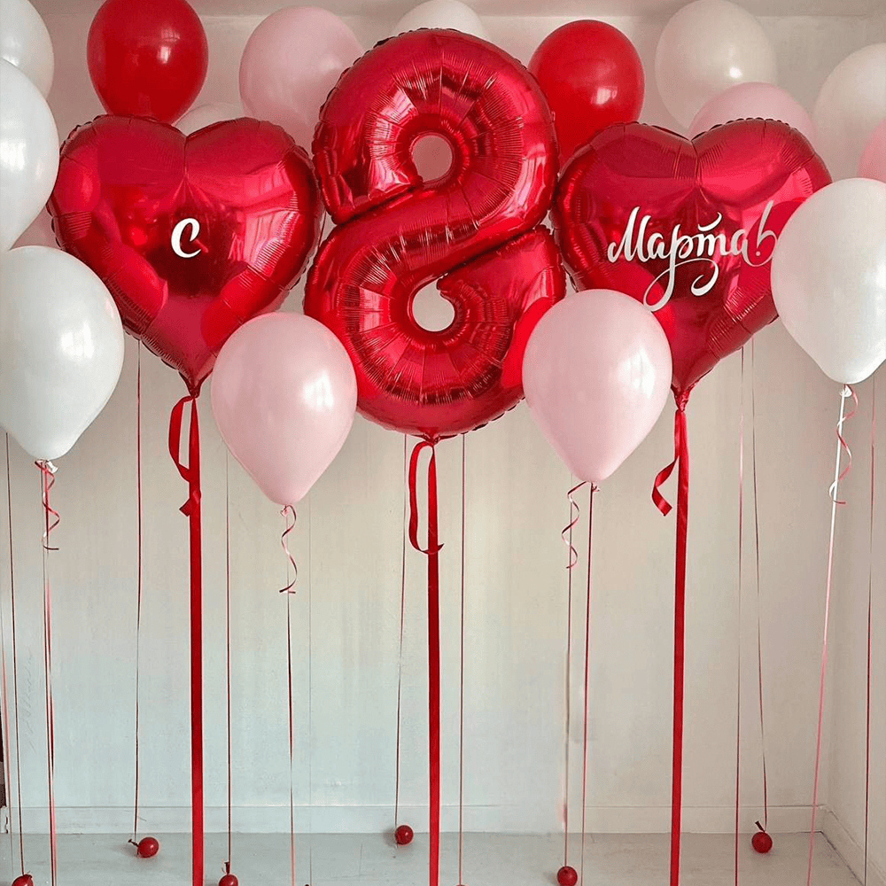Чарівна композиція з червоних і білих кульок, з любов’ю виражена у формі сердець. Яскрава вісімка символізує весняне оновлення і святковий настрій. Ідеальне оформлення для того, щоб виразити особливу увагу і тепло, створюючи атмосферу радості і гармонії.