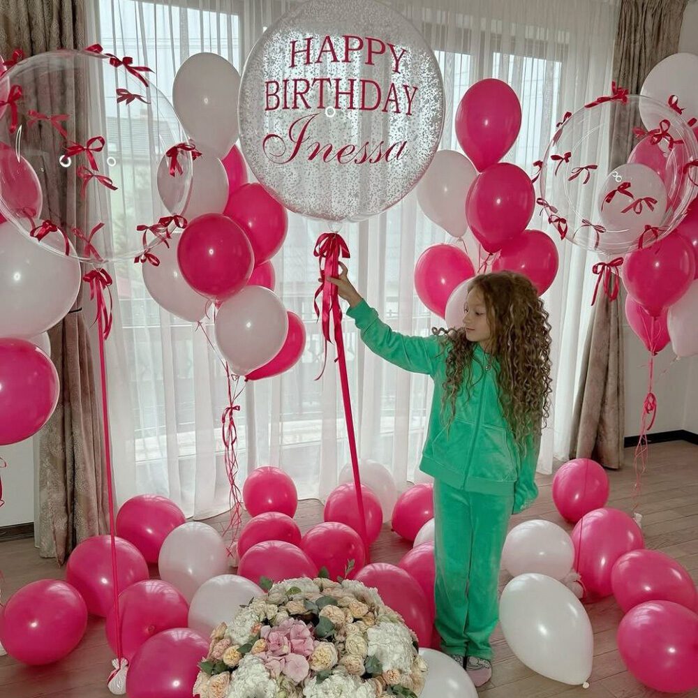 Яскраве та ніжне святкування Дня народження у теплій атмосфері. Рожева та біла кольорова гама повітряних кульок створює чарівний настрій, а велика куля з написом “Happy Birthday Inessa” додає особливого шарму. Іменинниця у стильному смарагдовому костюмі виглядає радісно та щасливо серед святкового декору. На передньому плані – прекрасна композиція з квітів, що підкреслює ніжність цього моменту. День, сповнений радості, сюрпризів та незабутніх емоцій! ???
