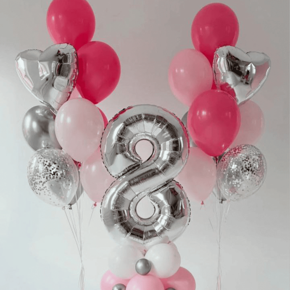 Чарівна композиція з срібних і рожевих кульок створює атмосферу ніжності та романтики. Сердечка і вісімка додають святкового настрою й символізують гармонію та нескінченну любов. Ідеальний акцент для особливого свята.