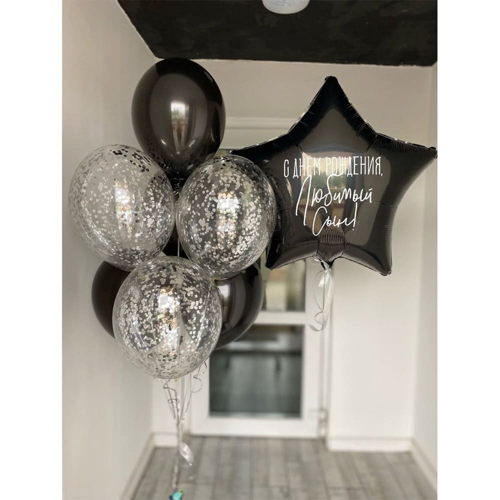 Эта стильная композиция из шаров в черных и серебристых тонах излучает теплоту и торжественность. Звезда с пожеланиями добавляет особого смысла, подчеркивая важность праздника для самых дорогих. Серебристые конфетти внутри прозрачных шаров делают общий вид искрящимся и праздничным, даря незабываемые мгновения радости.