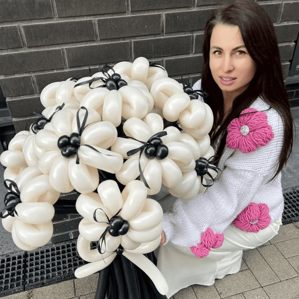Этот стильный букет из воздушных шариков в черно-белых тонах отличается особой изысканностью. Каждый цветок подчеркнут элегантным черным центром, что добавляет общему образу контрастности и шарма. Идеальный выбор для тех, кто ценит классическую красоту и сдержанную роскошь в деталях.