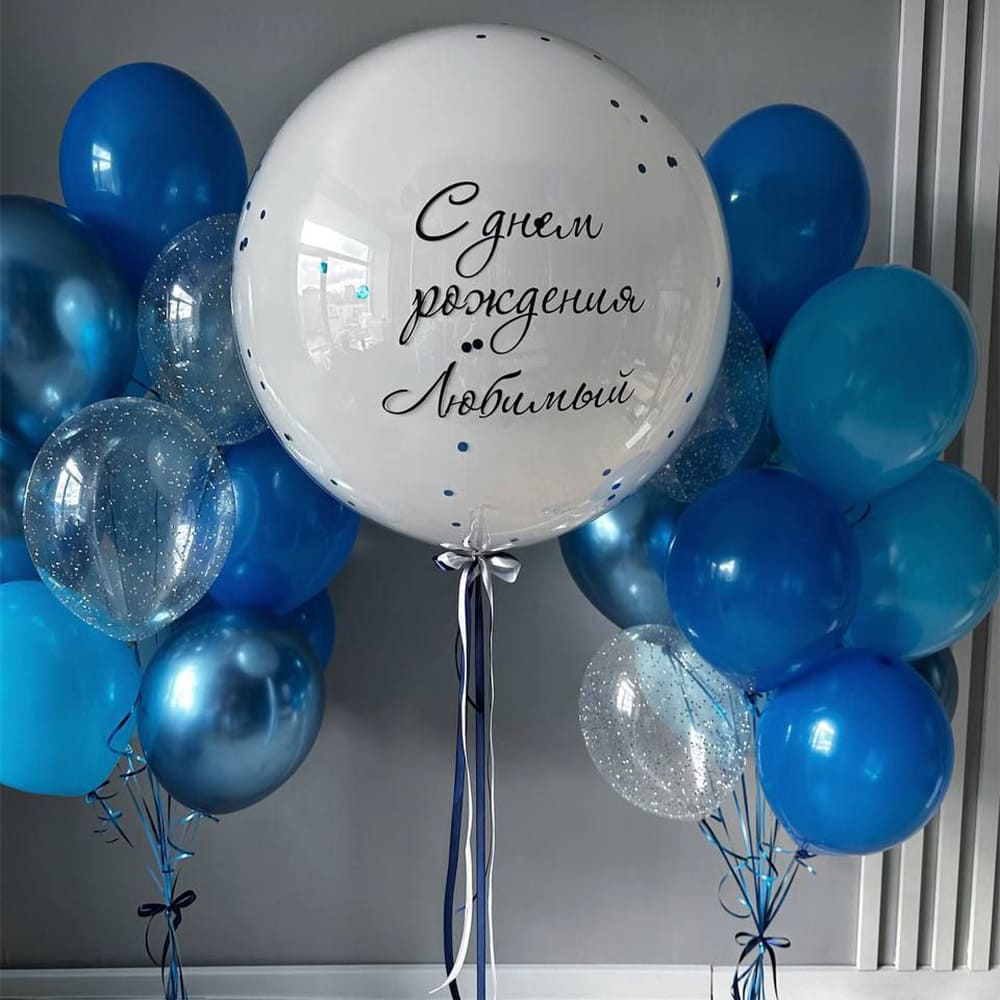Подарите своему любимому день, полный очарования, с этой нежной сине-белой композицией. Большие шарики с особым пожеланием создают атмосферу радости и любви, идеально подходят для незабываемого праздника.