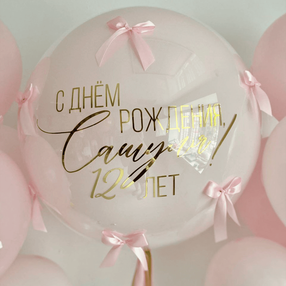 Этот большой шарик с эффектом зеркала завораживает своим изяществом и блеском. Его поверхность сверкает, отражая улыбки гостей и даря праздничной атмосфере неповторимый шарм. На шарик нанесено индивидуальное поздравление, которое придает особый смысл и делает его уникальным. Деликатные розовые бантики, украшающие шарик, придают ему элегантности и нежности, подчеркивая торжественность момента и делая его идеальным центром внимания на празднике.