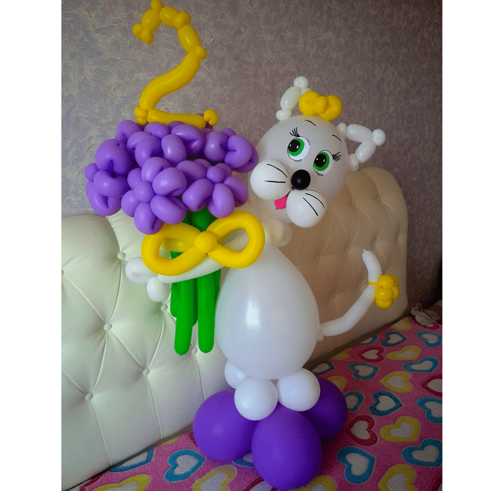 Очаровательная кошечка из воздушных шариков с большим букетом цветов — это нежный и одновременно эффектный подарок, который сразу создает праздничное настроение. Он выглядит очень милым, привлекает внимание и дарит искренние эмоции с первого взгляда. Большой букет придает композиции особую роскошь и делает ее идеальным вариантом для важных моментов, когда хочется удивить и подарить настоящую радость