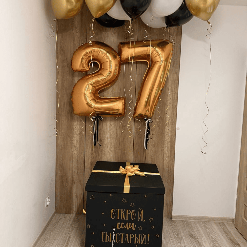 Утонченная композиция в золотых, черных и белых цветах создает атмосферу изысканности и стиля. Большие золотые цифры придают событию особый шарм, а праздничная коробка с интригующей подписью добавляет веселого настроения. Идеальный выбор для празднования с ноткой юмора и класса.