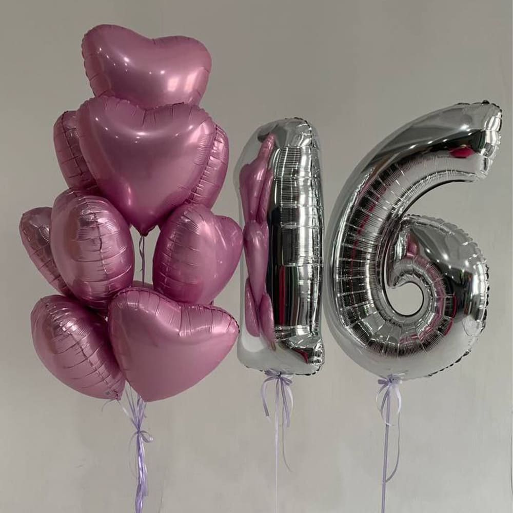Комбинация серебряных цифр и розовых сердец символизирует наступление особого возраста — 16 лет. Каждый шар излучает радость и энергию молодости, воплощая мечты и обещания будущего. Это праздничная композиция, дарящая яркие эмоции в этот важный день.