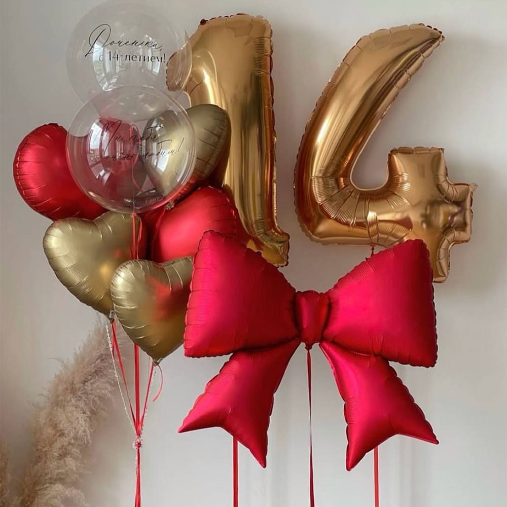 Празднуйте яркое начало юности с набором шаров. Сочетание золотых и красных шариков в форме сердец и огромный красный бант создают эффектный акцент в праздничном оформлении. Большая золотая надпись «14» символизирует важность этого жизненного этапа, когда мир открывается в новых красках и возможностях. Подарите себе и близким незабываемую атмосферу радости, где каждый момент наполнен теплом и любовью. С этим набором ваш особенный день станет грандиозным и незабываемым!