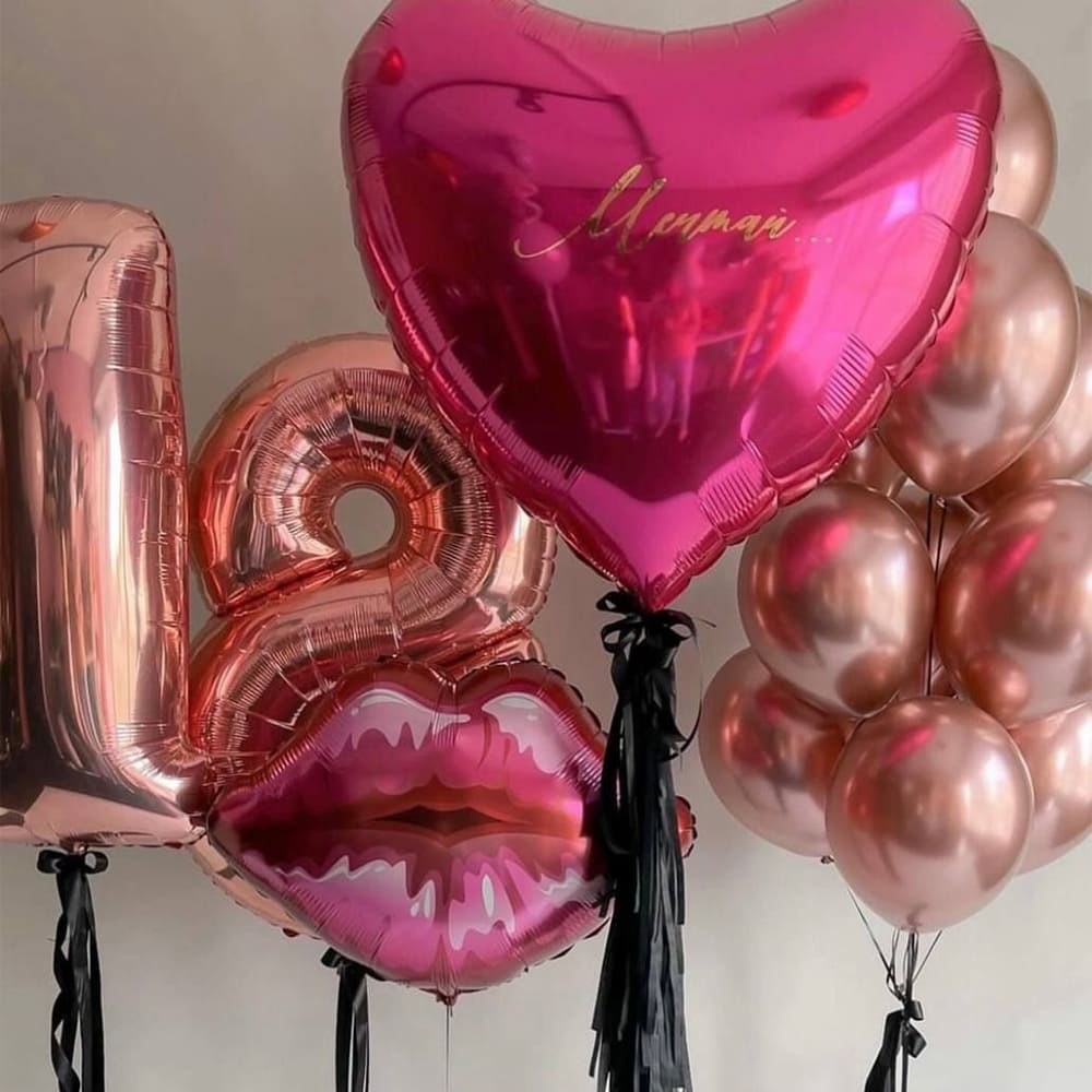 Яркая композиция для незабываемого дня рождения! Фольгированные цифры в оттенке rose gold дополнены эффектными акцентами: насыщенное розовое сердце с надписью, стильные «губки» и сияющие шары. Сочетание глубоких розово-золотых тонов с черными лентами создает элегантное, немного гламурное настроение.