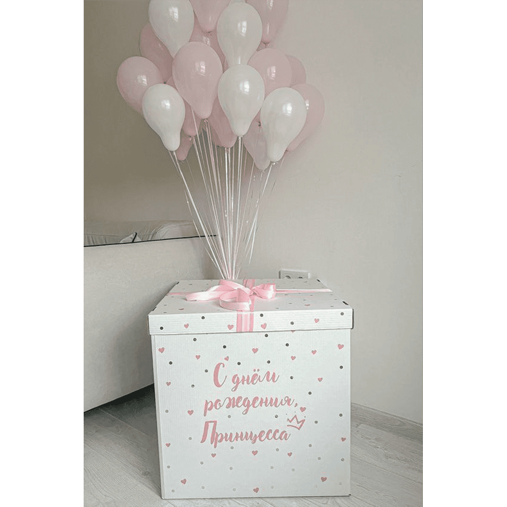 Эта волшебная композиция в нежно-розовых и белых тонах создает ощущение сказочной атмосферы. Большая праздничная коробка и легкие шары поднимают настроение и дарят незабываемую радость маленькой принцессе. Идеальный выбор для девичьего праздника, полного мечтаний и нежности.